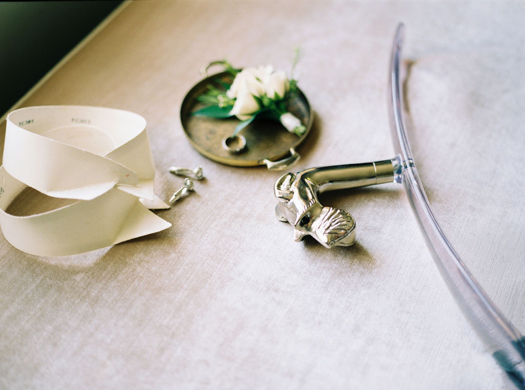 This hotel is a masterpiece, newly renovated with a modern 20’s vibe throughout their decor and interior design choices. Erin and Kevin played on the hotel’s amazing history and details with their invitation suite and some of their fashion choices. Take a look at all the prettiness below. I love being able to use custom pieces that mean something special to a bride and groom. Erin came ready with many of her fashion accessories and some personal details. Like the rabbit figures and her romantic sheer gloves.
